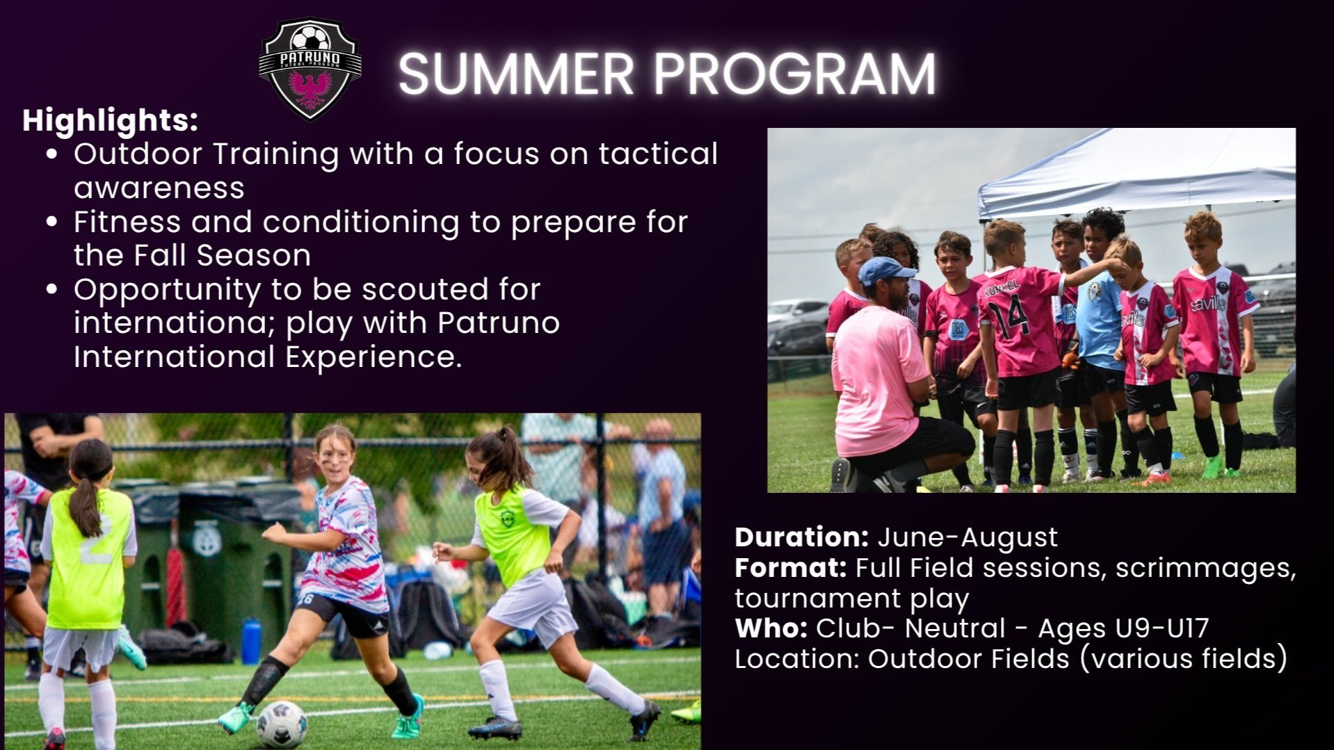 Patruno FP offers elite seasonal programs designed for dedicated players looking to stay sharp in the off-season. Whether youโre preparing for your upcoming club season, or just want to stay connected to the game, our Winter and Summer Programs provide a competitive, high-level training and playing environment.